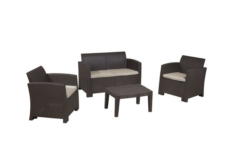 Σαλόνι σετ μοντέρνου σχεδιασμού χρώματος καφέ-grey-white. Διαθέτει έναν καναπέ, 2 πολυθρόνες και ένα τραπέζι όπου μπορείτε να το τοποθετήσετε σε οποιοδήποτε εξωτερικό χώρο. Είναι ένα σαλόνι που μπορεί να σας εξυπηρετήσει και να σας ικανοποιήσει με τον σωστό και μοντέρνο τρόπο που χρειαζόσαστε στον εξωτερικό σας χώρο. Αξιοποιήστε το στο έπακρο στην αυλή σας.