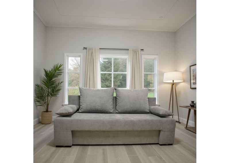 Τριθέσιος καναπές μοντέρνου σχεδιασμού χρώματος γκρι. Διαθέτει κάθισμα και πλάτη μέτριας σκληρότητας με εσωτερικό μηχανισμό που του επιτρέπει να γίνει κρεβάτι εύκολα και γρήγορα, ο εσωτερικός σκελετός του είναι από ξύλο οξιάς. Ιδανική και ποιοτική επιλογή για το καθιστικό σας. Αξιοποιήστε τον και χαρείτε τον με τον σωστό τρόπο στο σαλόνι σας.