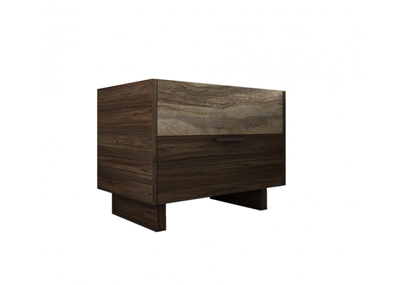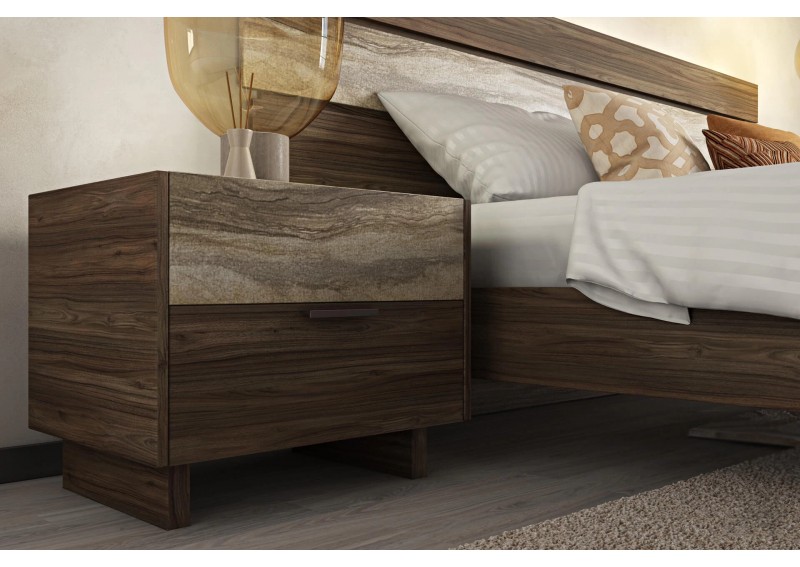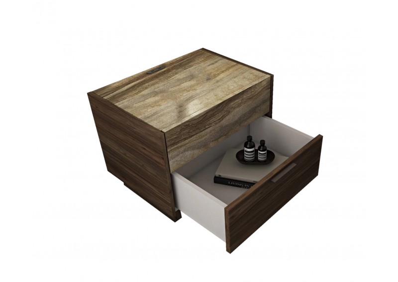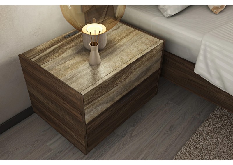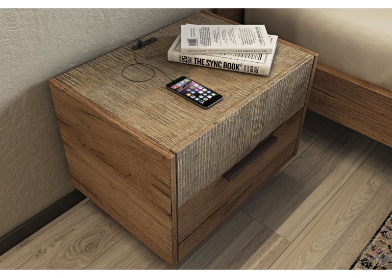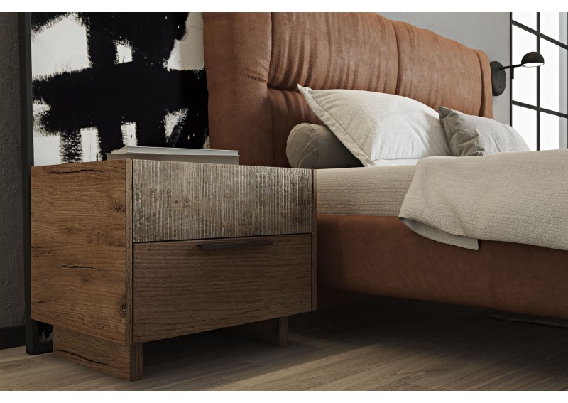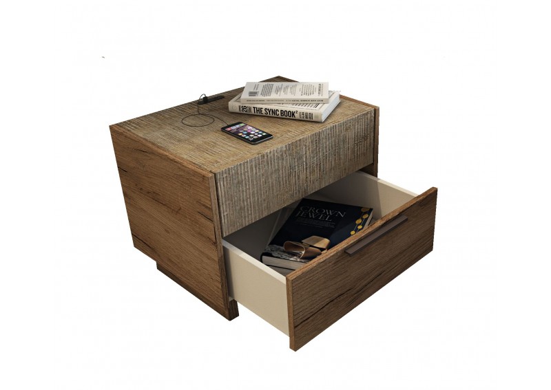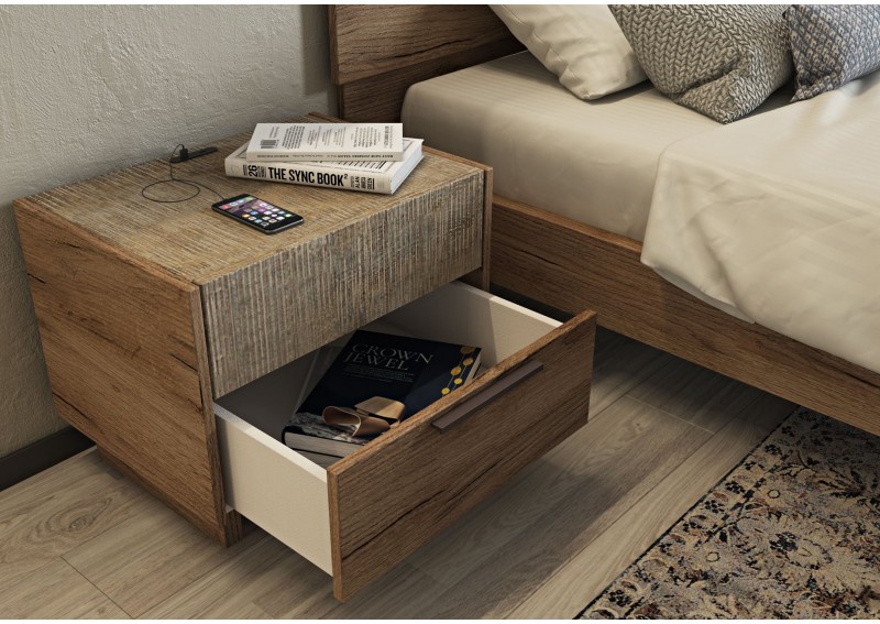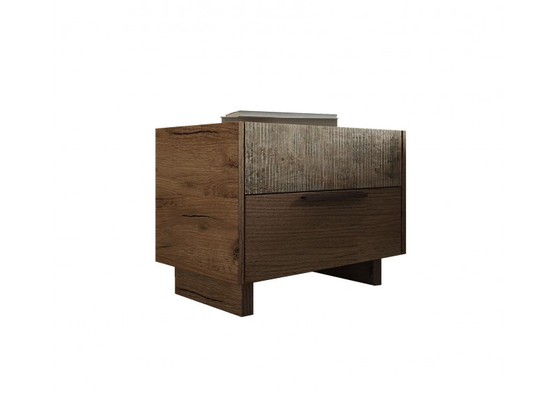 Το κομοδίνο είναι κατασκευασμένο από τεχνητό καπλαμά χρώματος light brown rustic oak - tobacco walnut και διαθέτει ιδιαίτερη ανάγλυφη διακοσμητική επιφάνεια στην επάνω αλλά και την μπροστινή του πλευρά. Όλα τα υλικά που χρησιμοποιούνται για την κατασκευή είναι υψηλών προδιαγραφών και διαθέτουν anti-scratch coating για μεγάλη αντοχή στις γρατζουνιές και ευκολία στο καθάρισμα και των πιο δύσκολων λεκέδων.