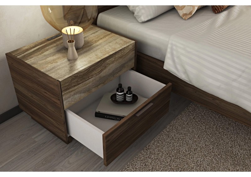 Το κομοδίνο διαθέτει δύο συρτάρια αποθήκευσης, το εσωτερικών των οποίων είναι κατασκευασμένο από ανάγλυφη μελαμίνη σε χρώμα linen beige, ενώ οι μηχανισμοί είναι ρόδας Teflon ιταλικής προέλευσης.