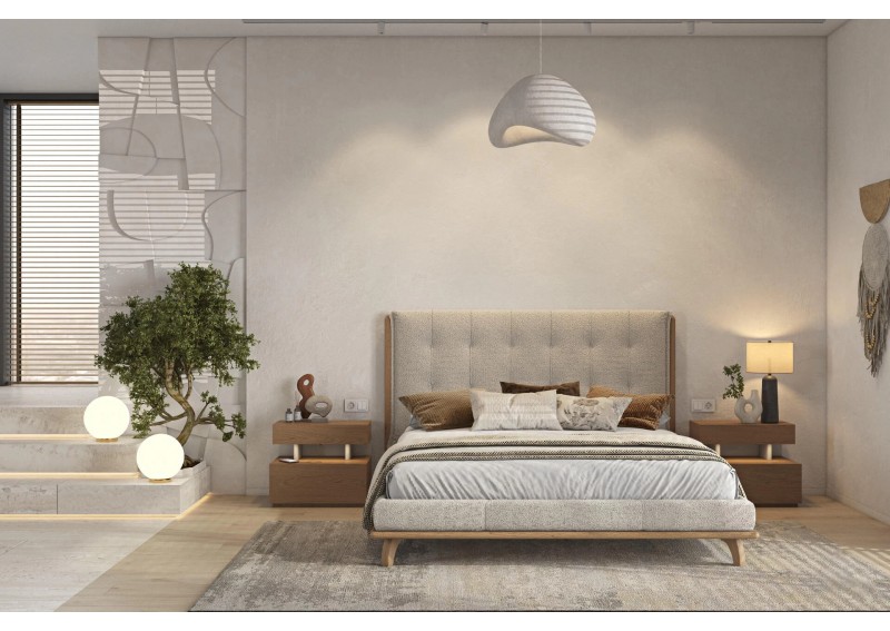 Μinimal σχεδιασμός με συνδυασμό ξύλου δρυς, μασιφένιων στοιχείων και υφασμάτινων λεπτομερειών. Το ύφασμα στο κεφαλάρι βγαίνει και πλένεται!