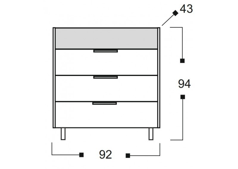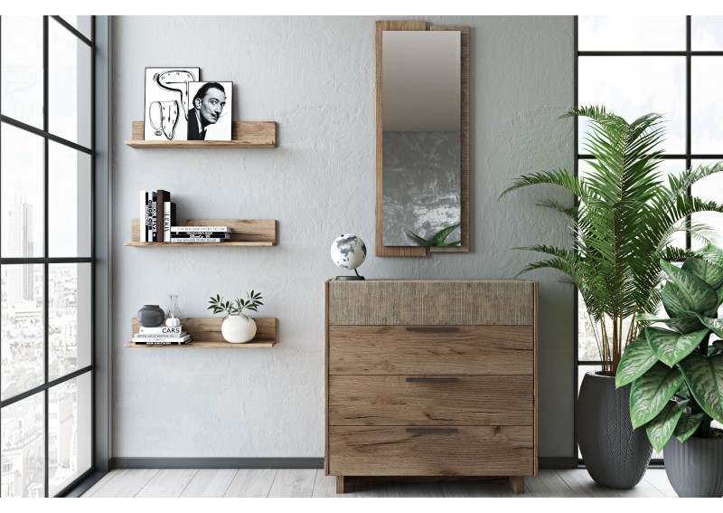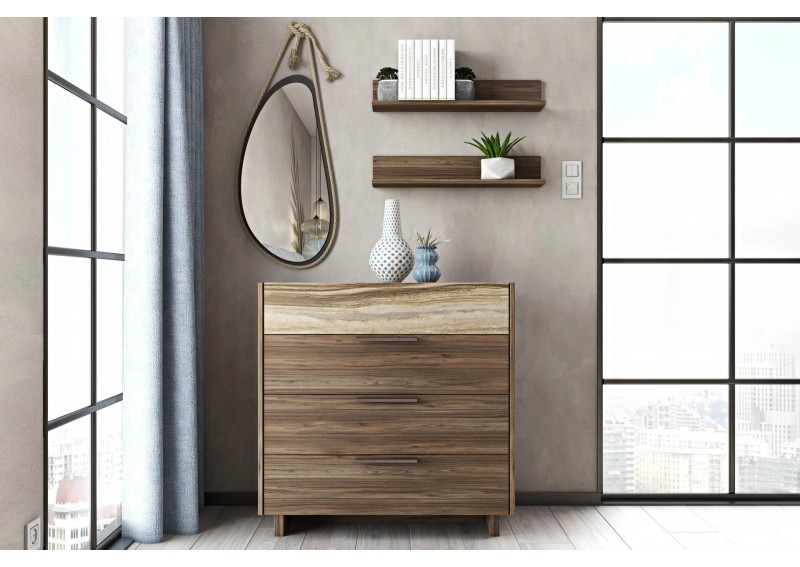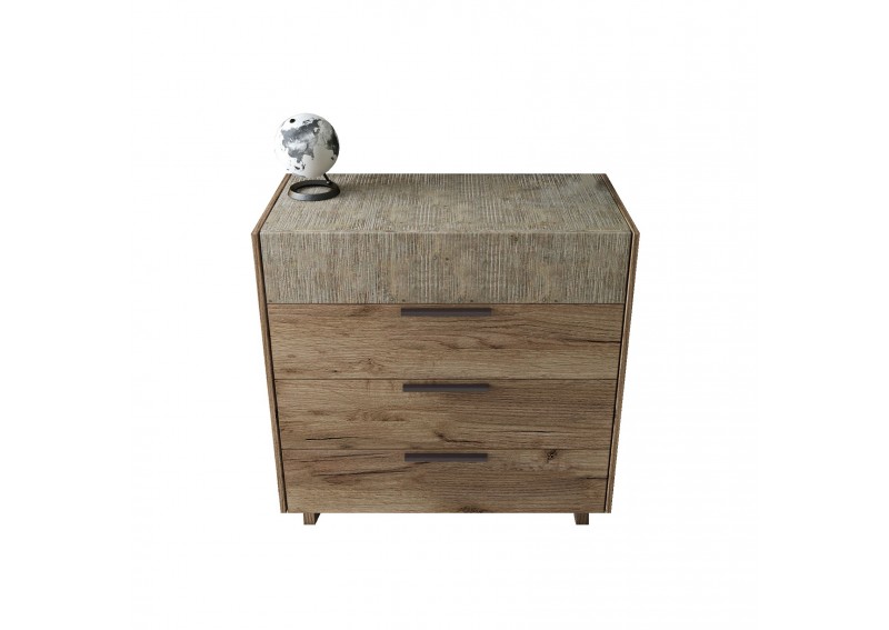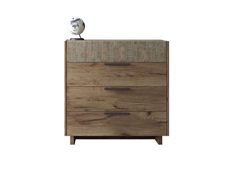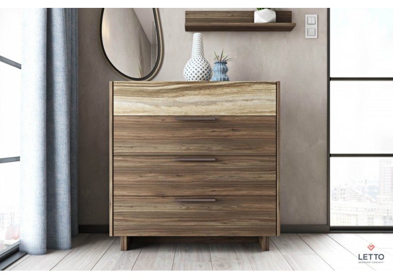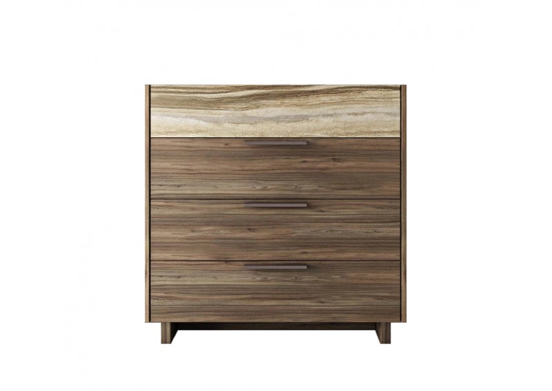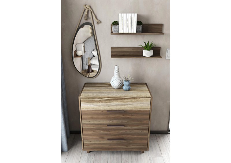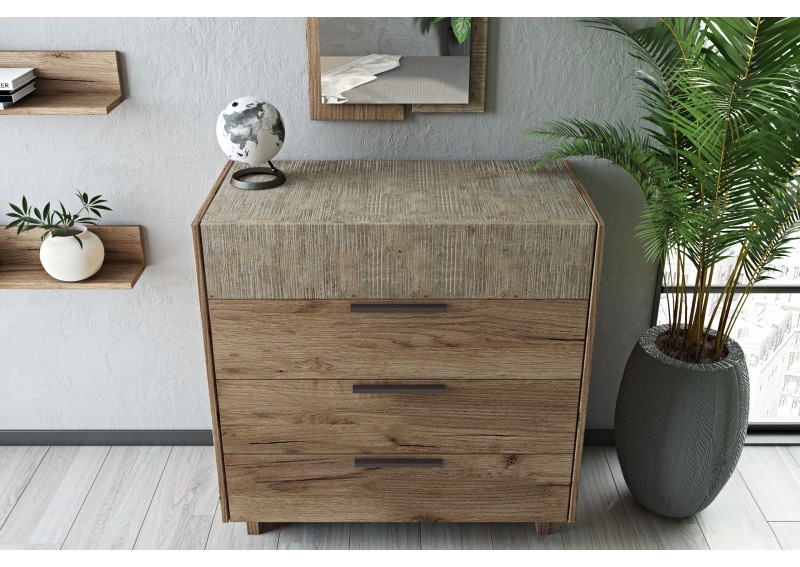 Η συρταριέρα διαθέτει 4 συρτάρια αποθήκευσης και είναι κατασκευασμένη από συνδυασμό τεχνητών υλικών, light brown rustic oak - tobacco walnut και της ιδιαίτερης διακοσμητικής επιφάνειας που βρίσκεται στο επάνω μέρος του επίπλου και το μπροστινό του συρταριού. Τα υλικά που χρησιμοποιούνται διαθέτουν anti-scratch coating για μεγάλη αντοχή στην χρόνια χρήση και ιδιαίτερη ευκολία στην καθαριότητα και των πιο δύσκολων λεκέδων.