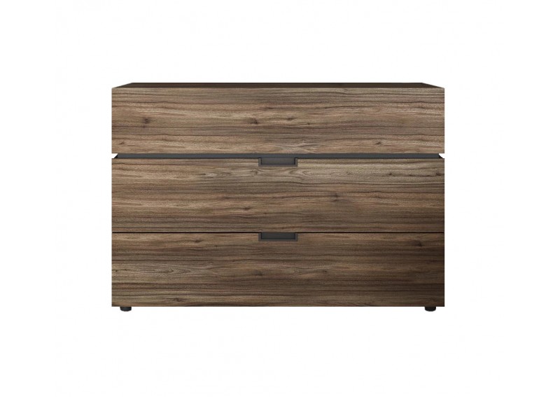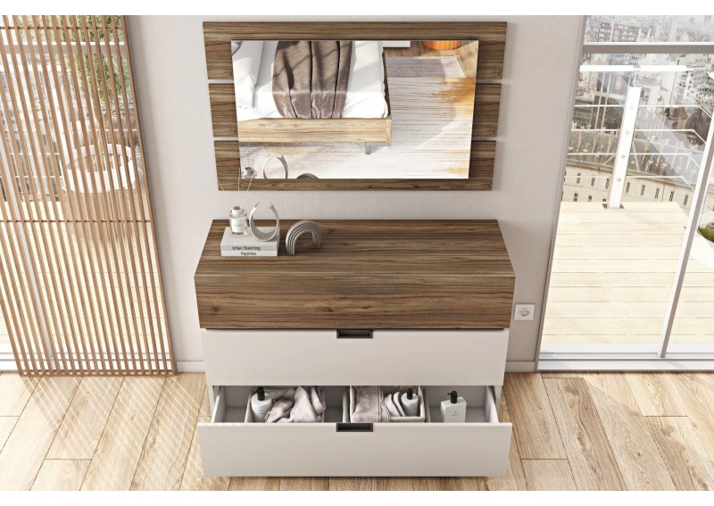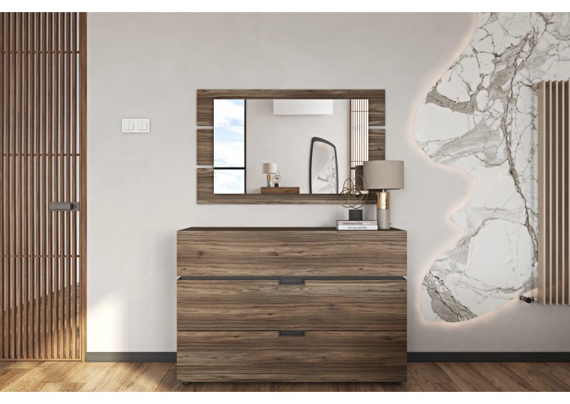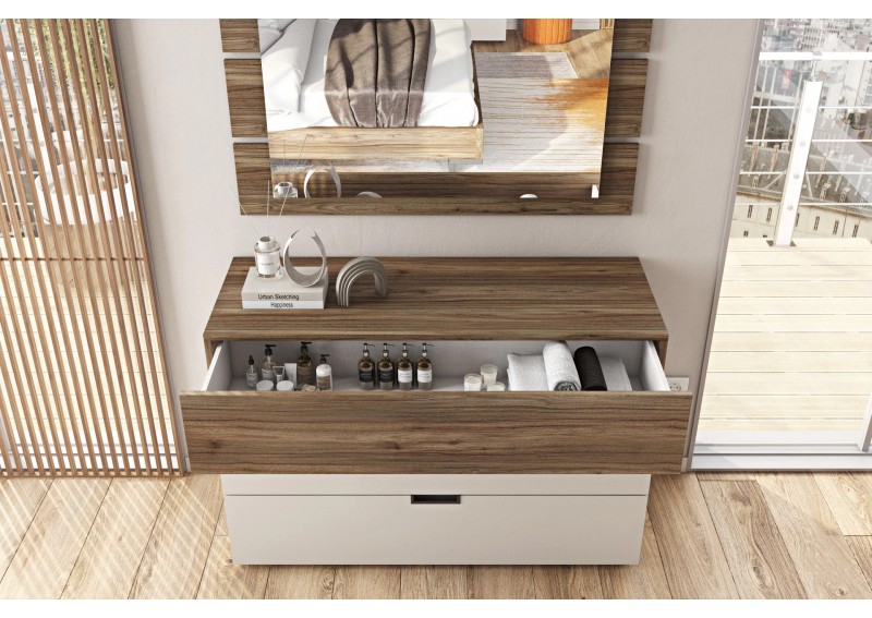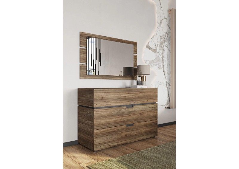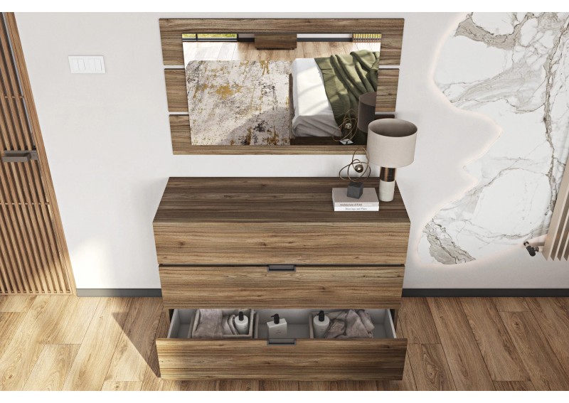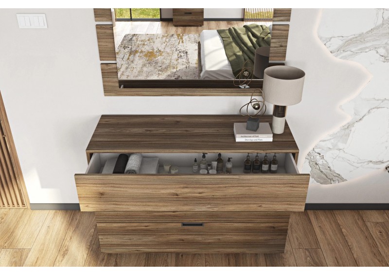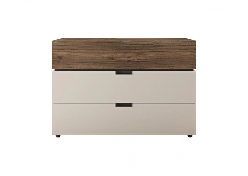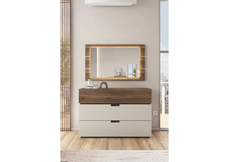Η συρταριέρα είναι κατασκευασμένη από συνδυασμό τεχνητού καπλαμά σε χρώμα tobacco walnut και συνδυάζεται άψογα με την μονόχρωμη διακοσμητική επιφάνεια σε χρώμα cream beige.
