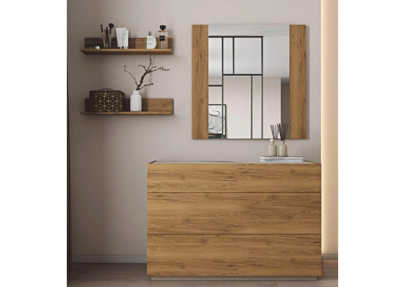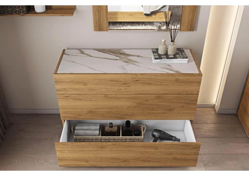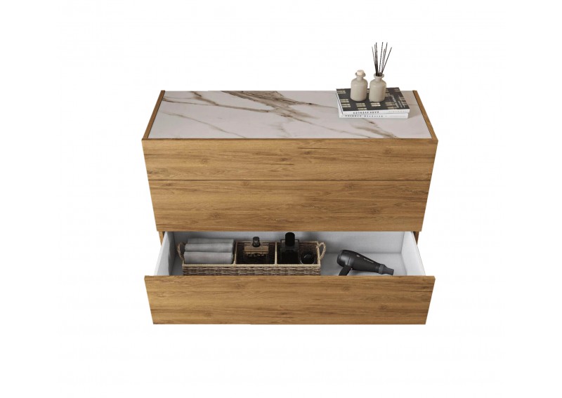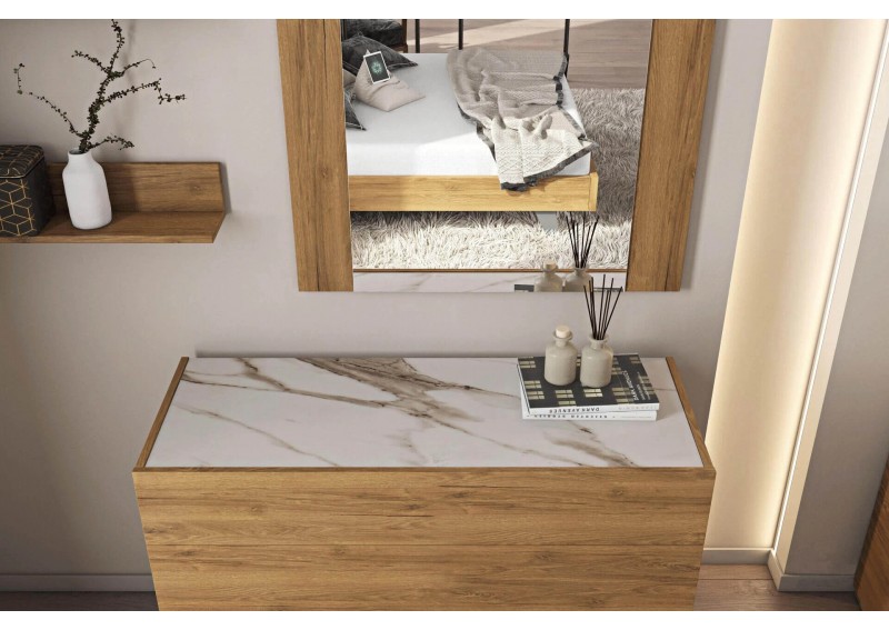 Η συρταριέρα είναι κατασκευασμένη από τεχνητό καπλαμά Lefkas oak με το χαρακτηριστικό φυσικό χρώμα της οξιάς και ταιριάζει αρμονικά με τη μαρμάρινη τεχνητή επιφάνεια στην επάνω πλευρά και τη λακαριστή βάση, ενώ οι σχεδιαστικές λεπτομέρειες της δημιουργούν ενιαία αίσθηση! Τα υλικά που χρησιμοποιούνται διαθέτουν αντιχαρακτικό coating για ιδιαίτερη αντοχή σε γρατζουνιές και εύκολο καθάρισμα των πιο απαιτητικών λεκέδων.