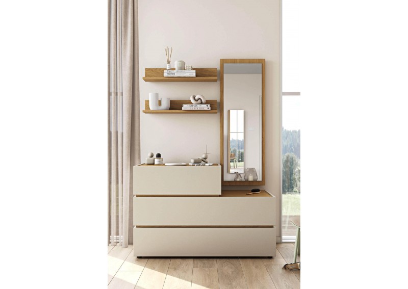 Η συρταριέρα διαθέτει τρία μεγάλα συρτάρια αποθήκευσης, είναι κατασκευασμένη από μελαμίνη σε χρώμα cream beige και συνδυάζεται άψογα με την light oak επιφάνεια η οποία υπάρχει στο επάνω μέρος του επίπλου. Τα υλικά που χρησιμοποιούνται παράγονται από 100% ανακυκλωμένο ξύλο και διαθέτουν ιδιαίτερο anti- scratch coating, με εξαιρετική αντοχή στις γρατζουνιές και τα χτυπήματα και μεγάλη ευκολία στο καθάρισμα των πιο απαιτητικών λεκέδων.