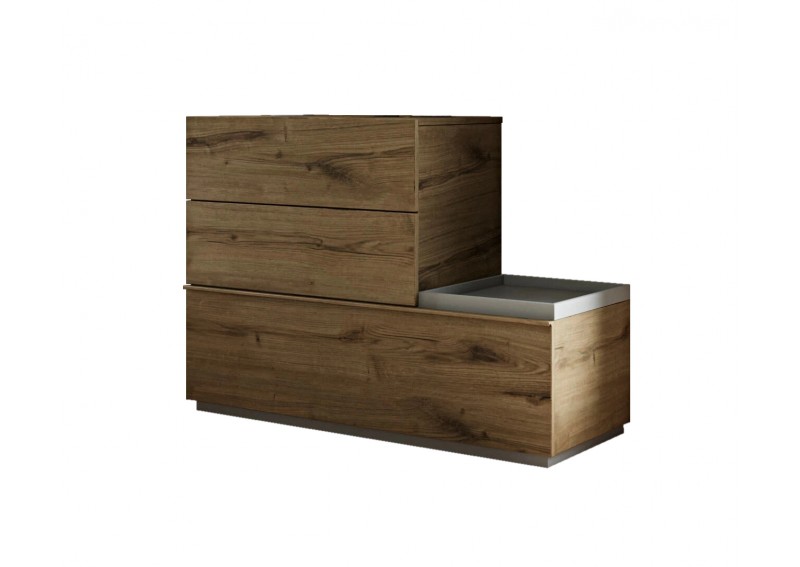 Η συρταριέρα με τα 3 συρτάρια της είναι κατασκευασμένη από φυσικό καπλαμά δρυς rustic με τα χαρακτηριστικά rustic νερά και ρόζους, που διαφοροποιούνται ανάλογα με το τμήμα του κορμού του δένδρου που χρησιμοποιήθηκε, αναδεικνύοντας τη φυσική του ομορφιά!