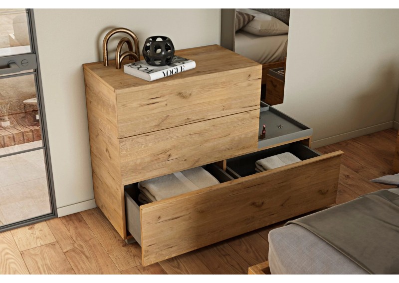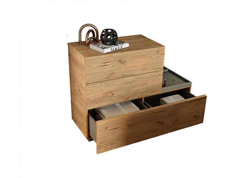 Είναι εξαιρετική επιλογή για την αποθήκευση των προσωπικών σας αντικειμένων, καθώς διαθέτει τρία μεγάλα συρτάρια, η εσωτερική πλευρά των οποίων είναι κατασκευασμένη από ανάγλυφη μελαμίνη σε χρώμα linen beige, ενώ οι μηχανισμοί των συρταριών είναι ιταλικής προέλευσης soft close για αθόρυβη λειτουργία.